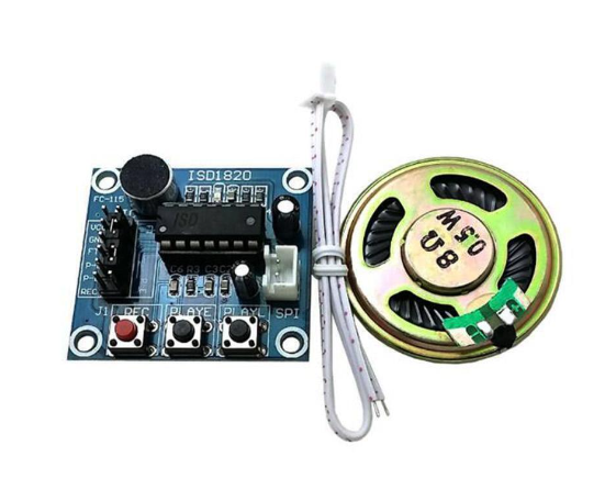 O Módulo ISD1820 é ideal para gravação e reprodução de áudio em projetos eletrônicos. Permite gravar até 75 segundos de voz e reproduzir diretamente pelo alto-falante, sem necessidade de microcontrolador.