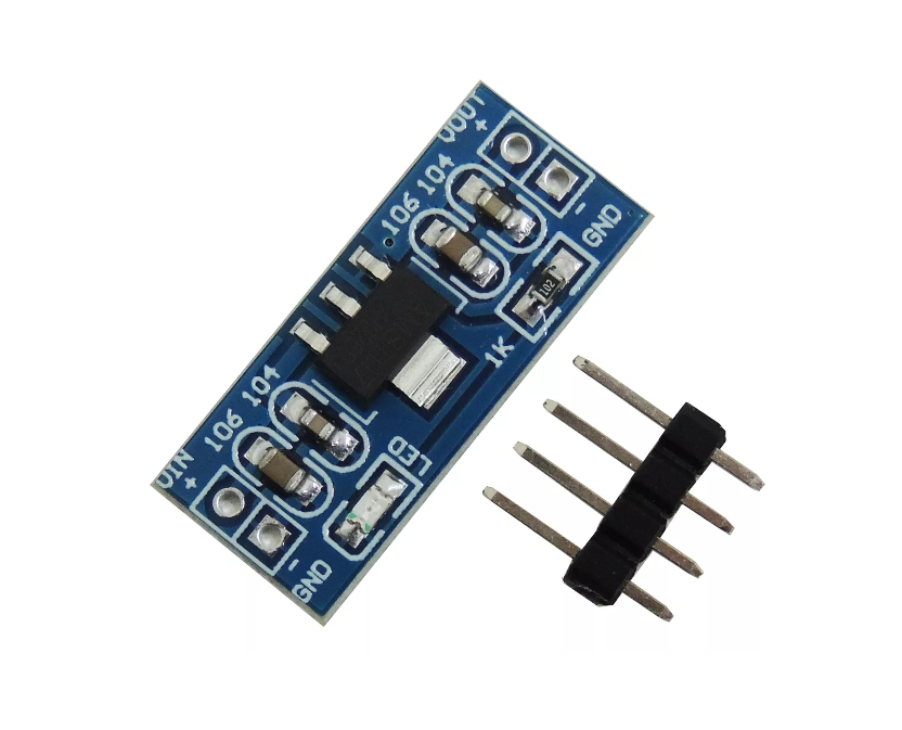 O módulo AMS1117 é um regulador de tensão linear utilizado para converter tensões mais altas em uma saída estável de 3,3V, sendo muito aplicado em projetos com microcontroladores e sensores.