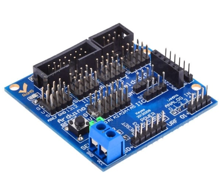 O Sensor Shield V5.0 é um módulo expansor para Arduino que facilita a conexão de sensores, módulos e servos, organizando as ligações de forma prática e eficiente.